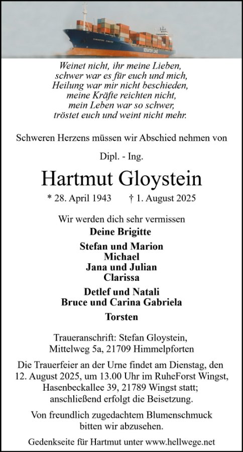 Voller Freude erinnere ich mich an die schönen Zeiten im Berufsleben mit Hartmut und wünsche der Familie viel Kraft, wenn er seine letzte Reise antritt.
