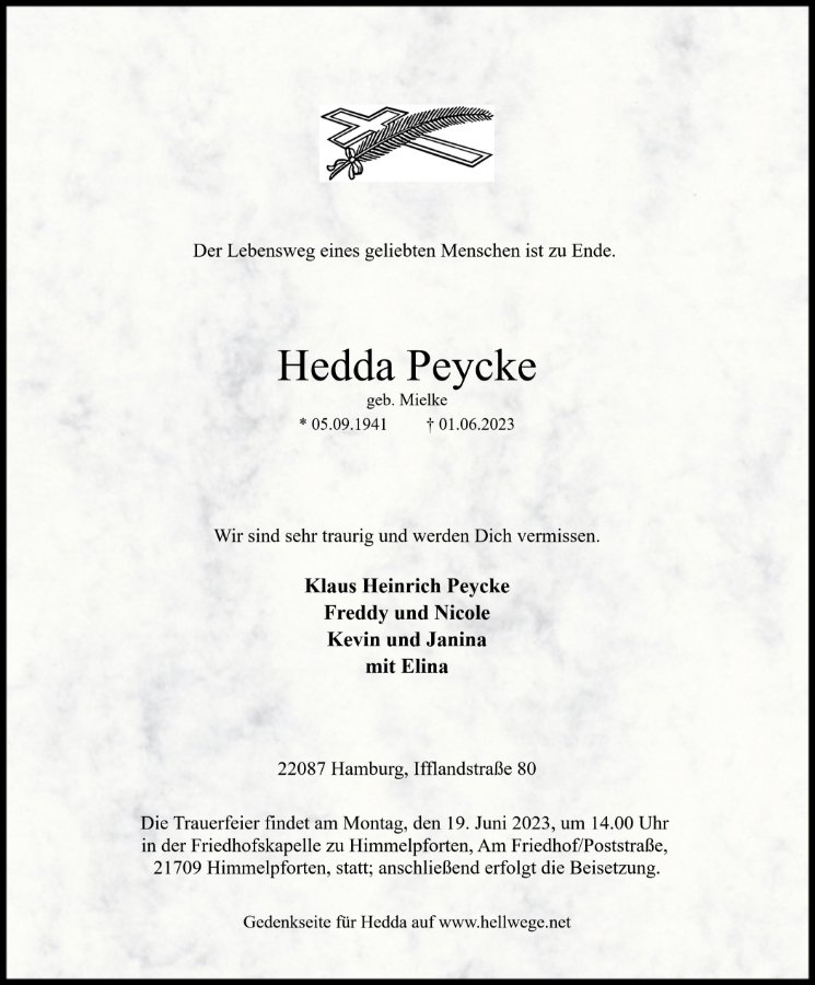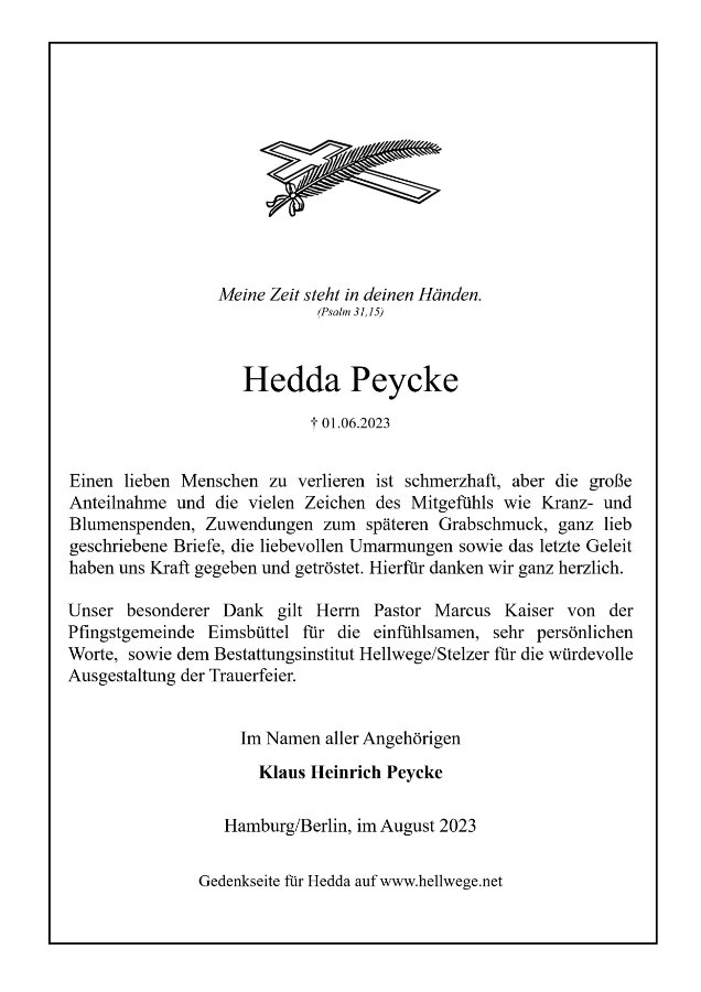 Ich lade Sie ein zum Abschied nehmen. Wir sehen uns dann dort, wenn wir Hedda ein letztes Geleit geben.